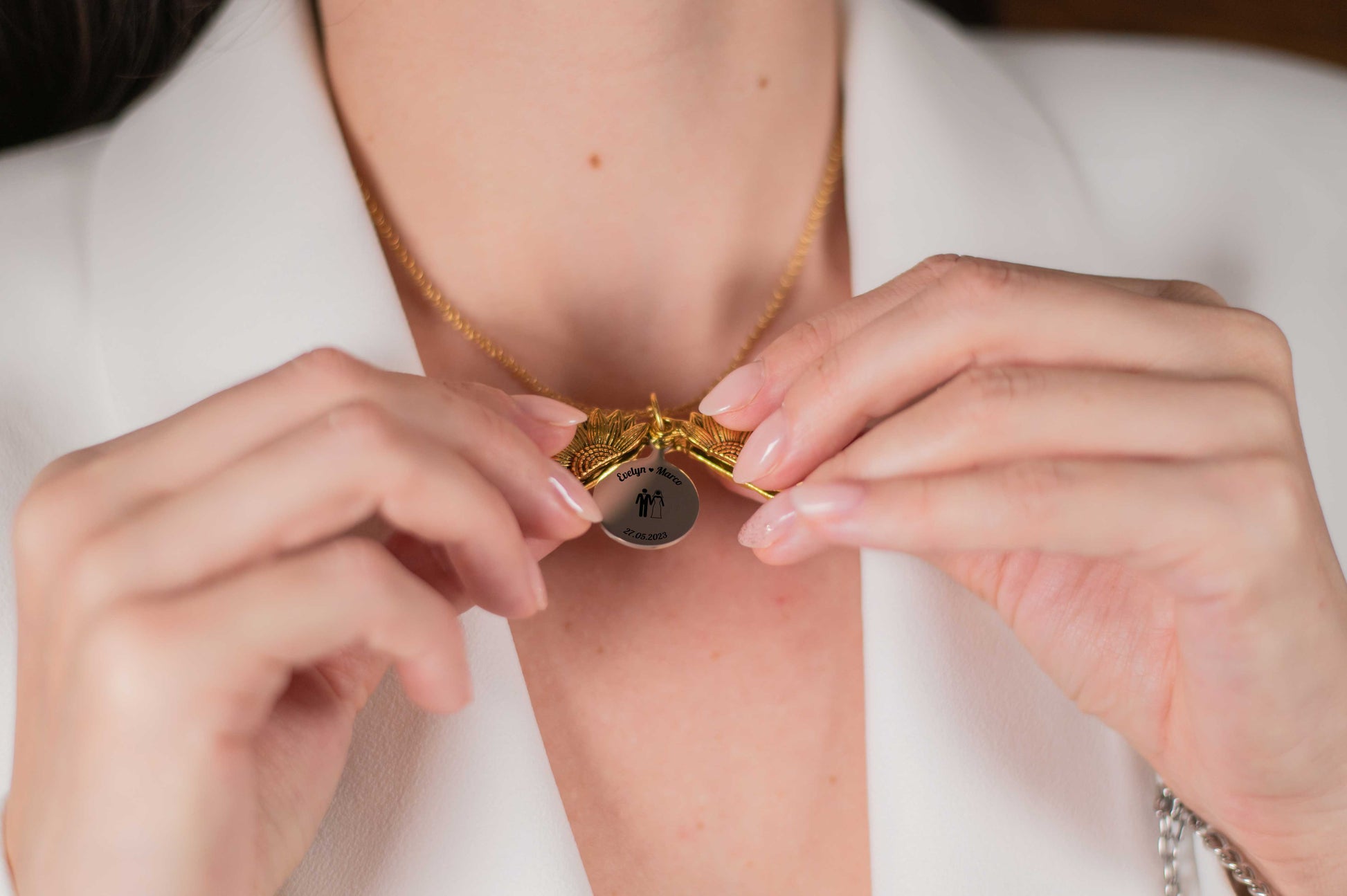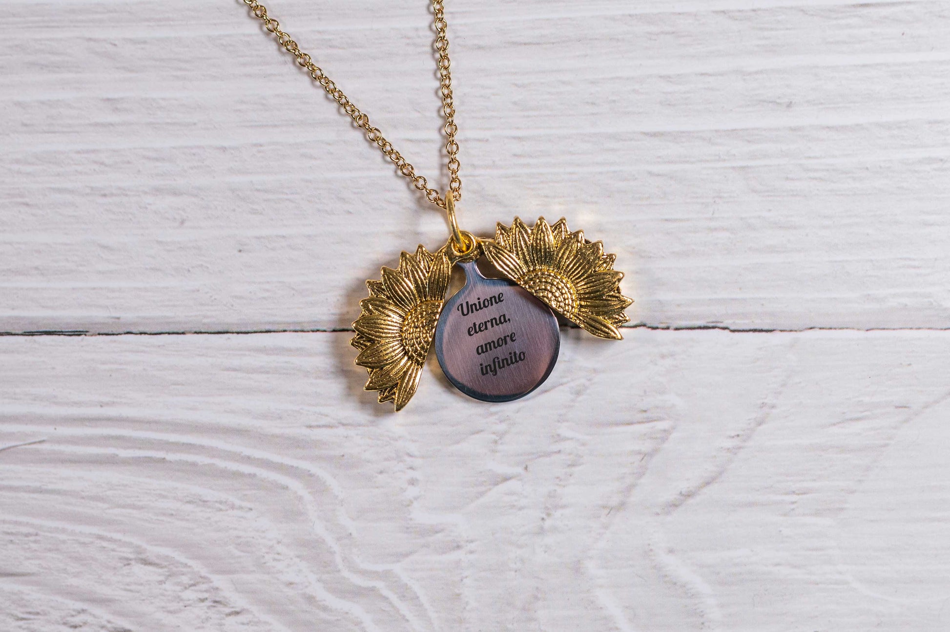 Esprimi il tuo affetto e conserva preziosi ricordi con la nostra Collana "Raggi di Memoria". Realizzata con cura in resistente acciaio inox placcata in oro 18 Kt, questa collana presenta una catena elegante che culmina in un pendente a forma di sole unico nel suo genere. Il pendente color oro si apre delicatamente, rivelando un ciondolo interno in argento, pronto per essere personalizzato con il tuo tocco unico.