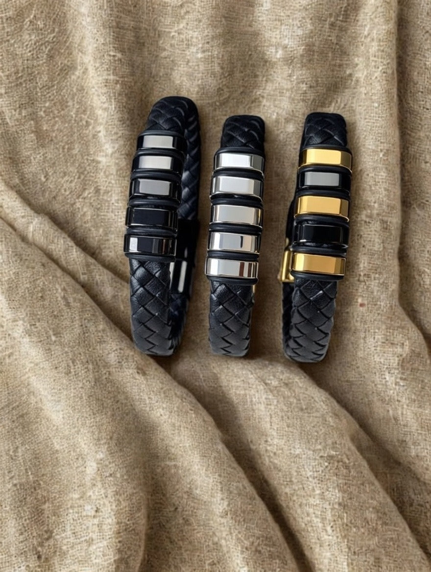 Materiali di Alta Qualità: Realizzato con pelle nera intrecciata e acciaio inossidabile, con finiture disponibili in colore argento, oro e nero. I materiali sono selezionati per garantire durata, eleganza e comfort.
